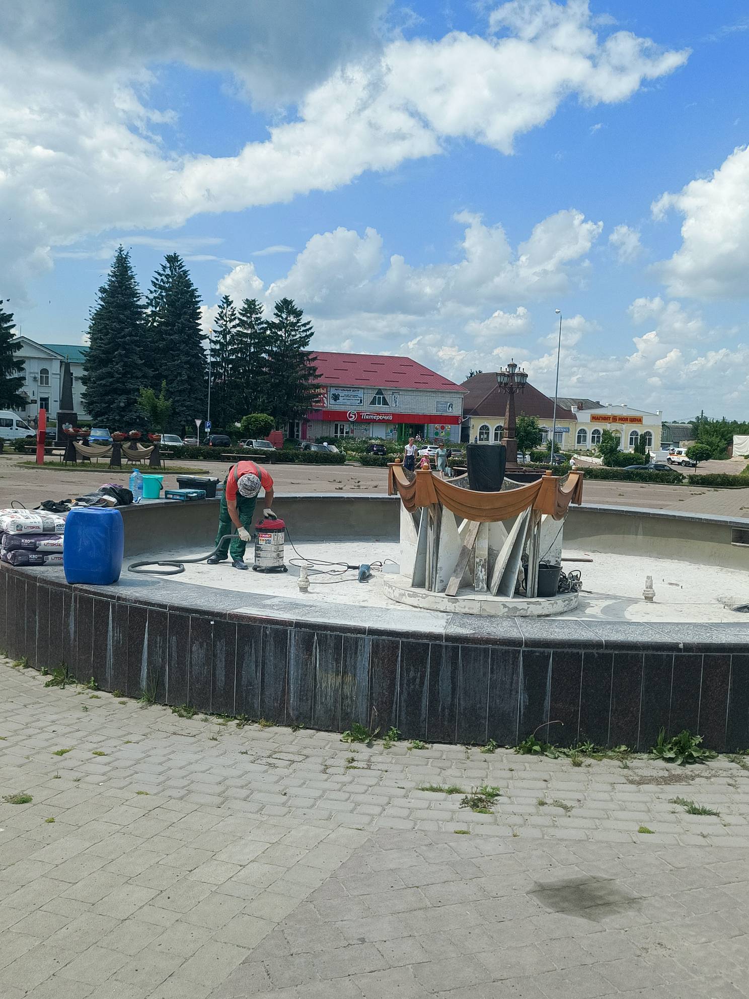 Подрядная организация «Аква Пойнт» из Брянска выполнила демонтаж старой плитки, провела чистку фонтана и проверку водонапорного оборудования.
