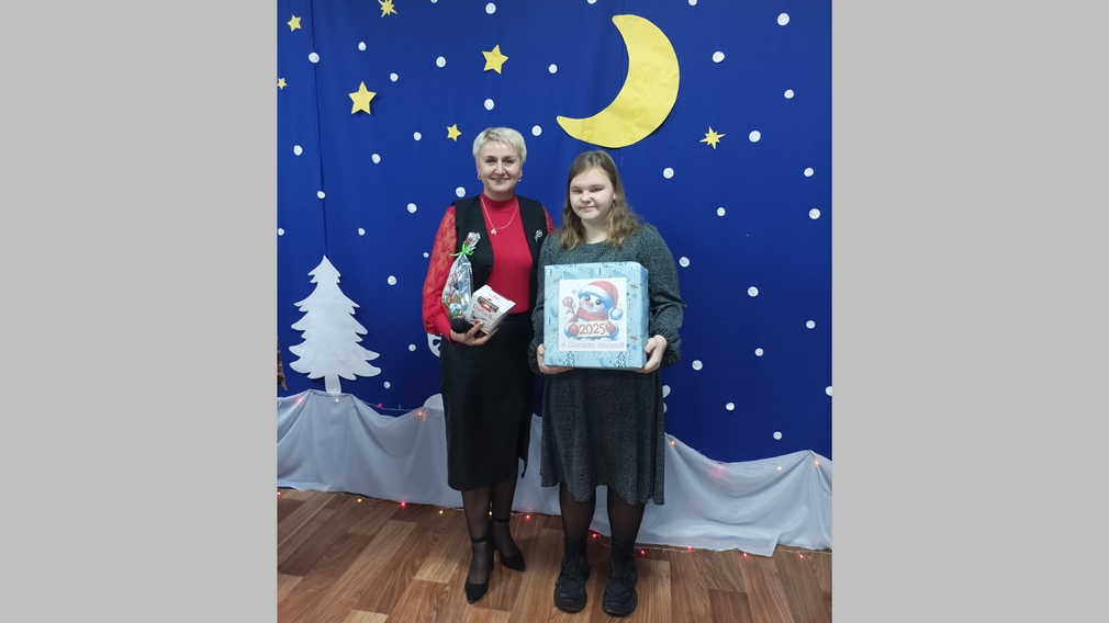 Девушку с наступающим Новым годом поздравила директор ЦДО Елена Володина и вручила подарок — кулинарный набор. Выпечкой тортов увлекается Арина. Она давно мечтала о таком подарке.